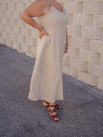 Vestido largo de tirantes con decoración en el escote beige